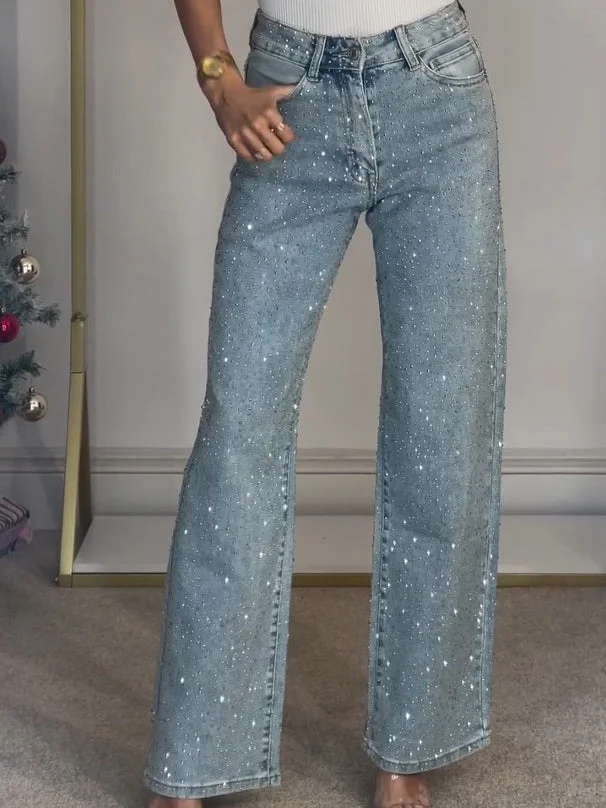 Dżinsy z wysokim stanem i prostą nogawką Diamanté oferują wyrafinowane połączenie stylu i wygody, charakteryzując się atrakcyjnym krojem z wysokim stanem, który podkreśla talię. Te dżinsy są wykonane z najwyższej jakości denimu i ozdobione błyszczącymi diamantowymi ozdobami zarówno z przodu, jak i z tyłu, dodając odrobinę blasku klasycznej sylwetce. Prosty krój nogawek zapewnia wszechstronność, dzięki czemu nadają się zarówno na co dzień, jak i na eleganckie okazje, a bogaty czarny kolor zapewnia ponadczasowy wygląd.